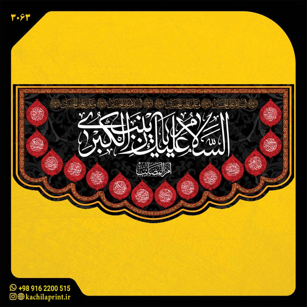 متن “لبیک یا حسین علیک السلام” با رنگ قرمز در وسط کتیبه و متن “یا اباعبدالله” با رنگ طلایی در سمت چپ و راست کتیبه به شکل مربع قرار گرفته است.